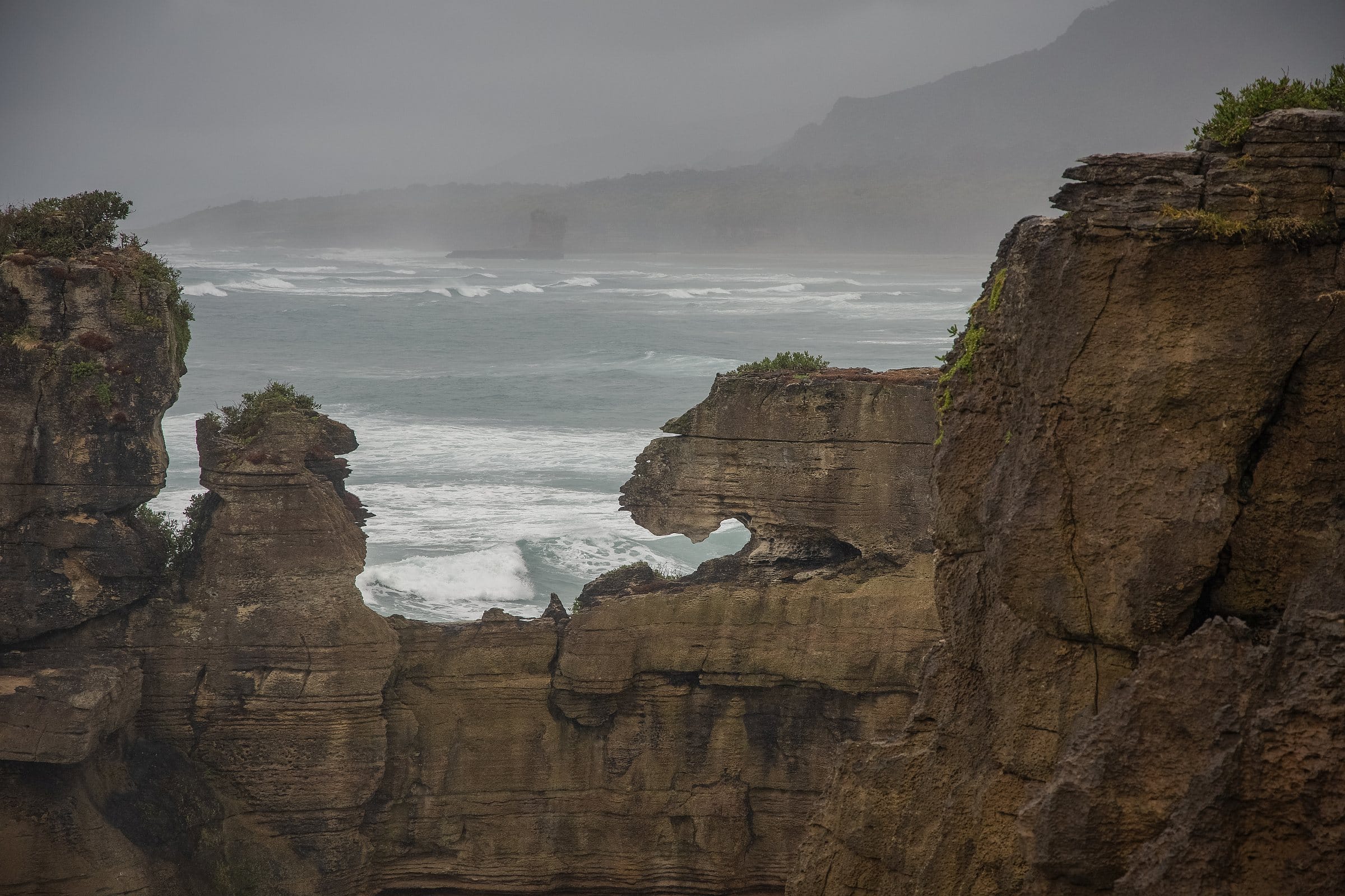 Weiter ging es an der wunderschönen Küste entlang – ich hätte am liebsten alle paar Meter für einen Fotostopp gehalten. Tosendes Meer und malerische Felsen. Leider hat es aber immer wieder geregnet. Und am Motukiekie Beach, wo wir 2018 tolle Seesterne gesehen hatten, war leider keine Ebbe. Als wir an den Pancake-Rocks ankamen (da waren wir 2011 schon einmal), regnete es erstmal nicht.